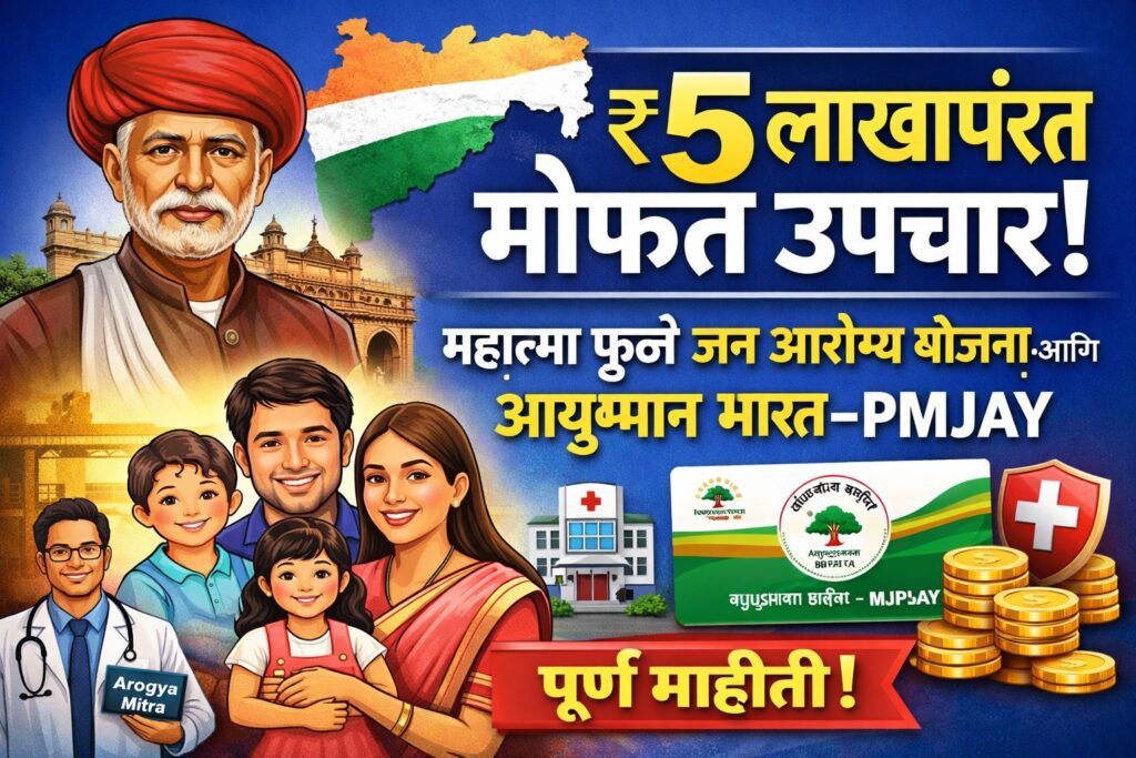 महात्मा ज्योतिराव फुले जन आरोग्य योजना (MJPJAY) आणि आयुष्मान भारत–प्रधानमंत्री जन आरोग्य योजना (PMJAY) या महाराष्ट्रातील नागरिकांसाठी अत्यंत उपयुक्त अशा आरोग्य विमा योजना आहेत, ज्यांचा उद्देश आर्थिकदृष्ट्या दुर्बल कुटुंबांना मोफत व गुणवत्तापूर्ण उपचार उपलब्ध करून देणे हा आहे. या योजनांअंतर्गत पात्र लाभार्थ्यांना निश्चित रकमेपर्यंत (साधारणपणे प्रति कुटुंब दरवर्षी लाखो रुपयांपर्यंत) कॅशलेस उपचारांची सुविधा मिळते, ज्यामुळे मोठ्या आजारांवरही आर्थिक ताण न येता उपचार घेता येतात. या योजनांचा लाभ घेण्यासाठी लाभार्थ्याचे नाव अधिकृत पात्र यादीत असणे आवश्यक आहे, ज्यात पिवळे, केशरी रेशन कार्डधारक किंवा SECC डेटामधील कुटुंबांचा समावेश असतो. उपचारासाठी राज्यातील आणि देशभरातील अधिकृत नेटवर्क हॉस्पिटलमध्ये जाऊन “महा आरोग्य कार्ड” किंवा आयुष्मान कार्ड दाखवून थेट कॅशलेस उपचार मिळू शकतात. या योजनेंतर्गत हृदयविकार, किडनी, कॅन्सर, अपघात, प्रसूती तसेच इतर गंभीर आजारांवर शस्त्रक्रिया आणि उपचारांचा समावेश केला आहे. अर्ज प्रक्रिया सुलभ असून, जवळच्या महा ई-सेवा केंद्र, CSC सेंटर किंवा अधिकृत हेल्थ कॅम्पमध्ये जाऊन आधार कार्ड, रेशन कार्ड आणि मोबाईल नंबरच्या मदतीने नोंदणी करता येते. नोंदणी झाल्यानंतर लाभार्थ्याला आरोग्य कार्ड दिले जाते, ज्याचा वापर उपचारासाठी केला जातो. या योजनेचे सर्वात मोठे वैशिष्ट्य म्हणजे उपचाराच्या वेळी कोणतेही पैसे आगाऊ द्यावे लागत नाहीत, कारण सर्व खर्च शासनाकडून थेट हॉस्पिटलला दिला जातो. त्यामुळे गरीब व मध्यमवर्गीय कुटुंबांना मोठ्या वैद्यकीय खर्चापासून दिलासा मिळतो. याशिवाय, या योजनांमुळे वेळेवर उपचार घेण्याची सवय वाढते आणि आरोग्याबद्दल जागरूकता निर्माण होते. त्यामुळे, जर तुम्ही किंवा तुमच्या कुटुंबातील सदस्य या योजनेसाठी पात्र असाल, तर त्वरित नोंदणी करून या आरोग्य सुरक्षा योजनेचा लाभ घ्या, कारण ही योजना “खर्च न करता” दर्जेदार उपचार घेण्याची एक सुवर्णसंधी उपलब्ध करून देते. आज आपण या योजनेची सर्व सविस्तर माहिती या लेखात बघणार आहोत. त्या मुळे हा लेख आवर्जून वाचा.
